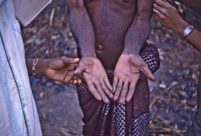 This 1969 photograph, taken in Dekina, Nigeria, showed the palms of a male smallpox sufferer that displayed lesions due to this viral disease. During the Nigerian-Biafran war, members of the CDC refugee relief team investigated the possibility of a smallpox outbreak in Dekina, which was located north of the Nigerian refugee camps. It was here, that CDC’s Dr. Lyle Conrad, confirmed that patients were infected with smallpox, and the CDC staff was able to contain the virus, and treat many of the victims.